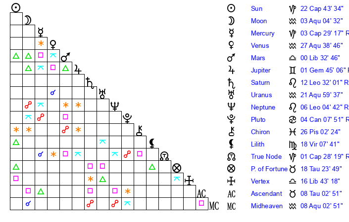 | Moon | 3 Aquarius 0 | 26 Scorpio 40 | 12 Capricorn 40 |