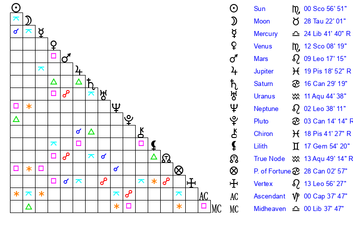 | Moon | 28 Taurus 23 | 15 Sagittarius 13 | 9 Gemini 13 |