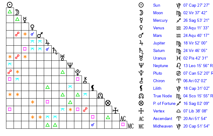 | Moon | 2 Virgo 25 | 29 Aries 35 | 27 Gemini 10 |