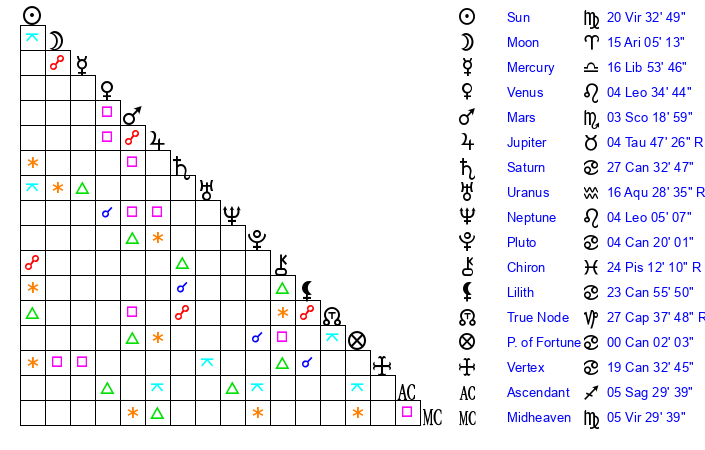 | Sun | 20 Virgo 33 | 21 Virgo 9 | 9 Capricorn 43 |