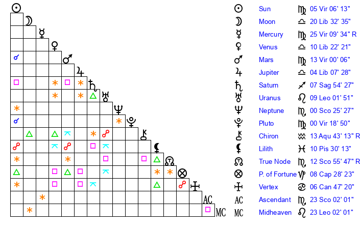 | Sun | 5 Virgo 6 | 5 Virgo 38 | 12 Scorpio 1 |