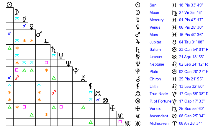 | Sun | 18 Pisces 34 | 19 Pisces 22 | 3 Cancer 31 |