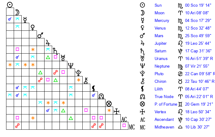 | Sun | 0 Scorpio 19 | 1 Scorpio 32 | 5 Aquarius 33 |