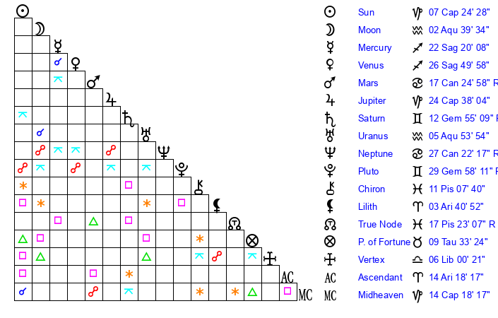 | Jupiter | 24 Capricorn 24 | 21 Cancer 40 | 18 Aquarius 4 |