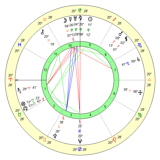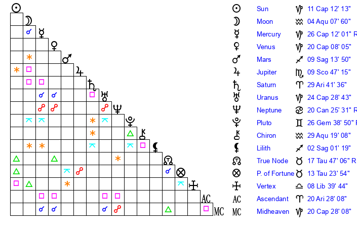 | Venus | 20 Capricorn 9 | 29 Aquarius 32 | 10 Gemini 37 |