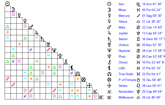 | Sun | 14 Scorpio 41 | 15 Scorpio 32 | 8 Pisces 16 |
