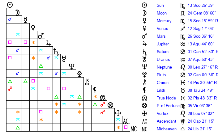 | Sun | 13 Scorpio 26 | 14 Scorpio 32 | 6 Pisces 1 |