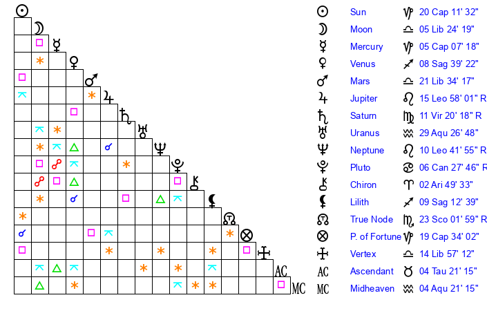 | Sun | 20 Capricorn 11 | 21 Capricorn 29 | 6 Taurus 8 |