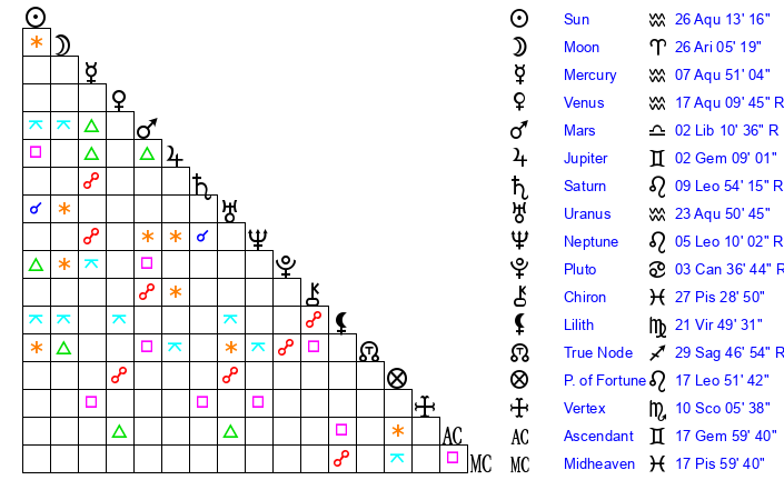 | Moon | 26 Aries 0 | 2 Libra 31 | 18 Pisces 16 |