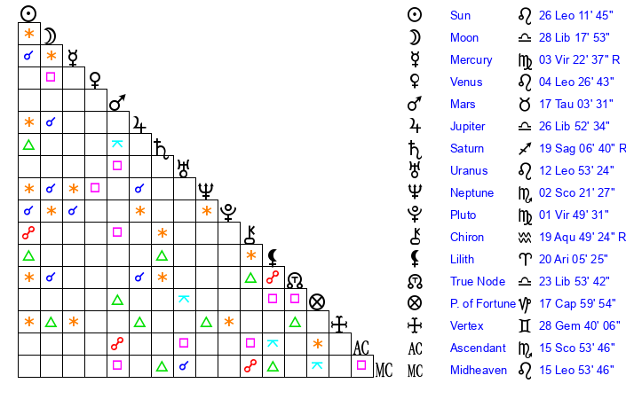 | Sun | 26 Leo 11 | 26 Leo 58 | 1 Scorpio 46 |