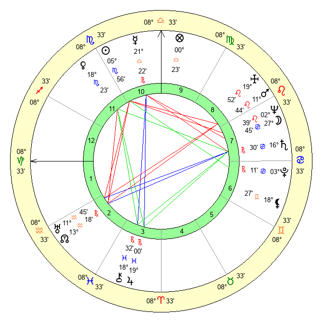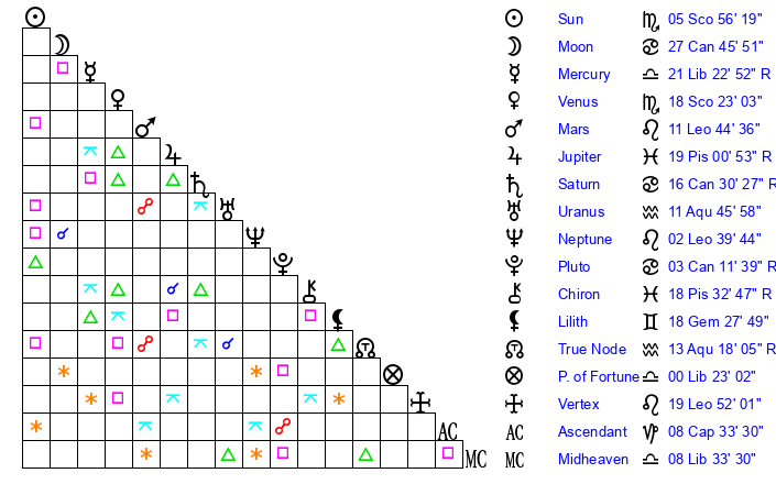 | Sun | 5 Scorpio 56 | 7 Scorpio 16 | 27 Aquarius 28 |