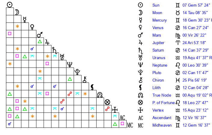 | Moon | 13 Taurus 59 | 14 Cancer 10 | 12 Taurus 10 |