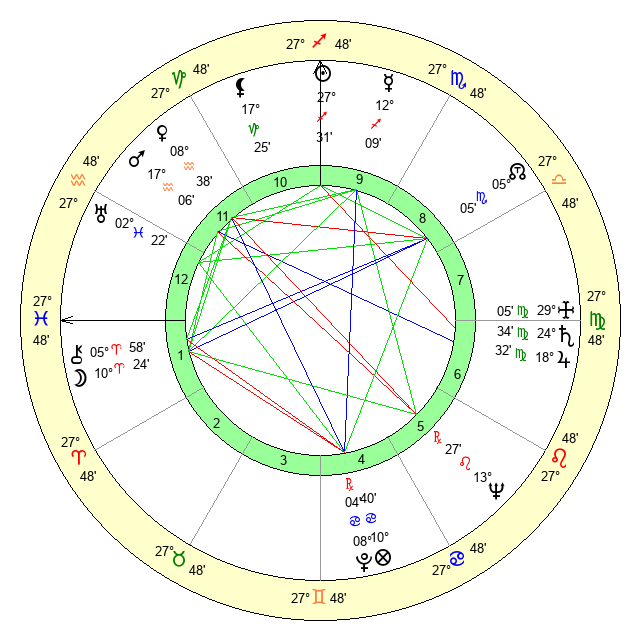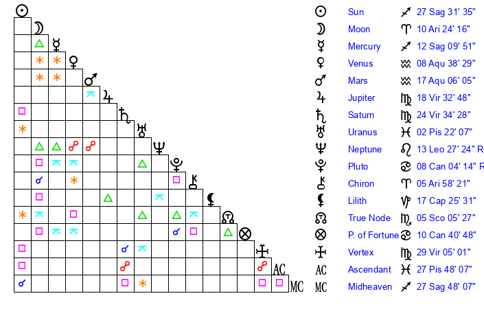 | Moon | 10 Aries 27 | 24 Sagittarius 4 | 19 Aquarius 34 |