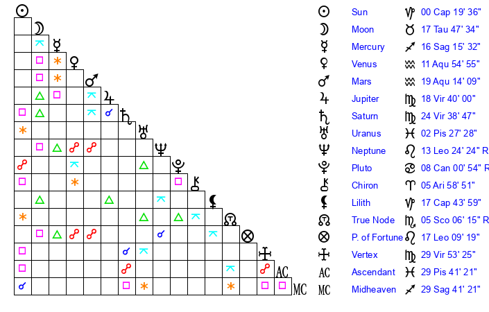 | Moon | 17 Taurus 55 | 27 Capricorn 34 | 23 Pisces 24 |
