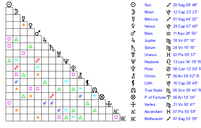 | Saturn | 25 Virgo 0 | 25 Pisces 15 | 21 Virgo 2 |