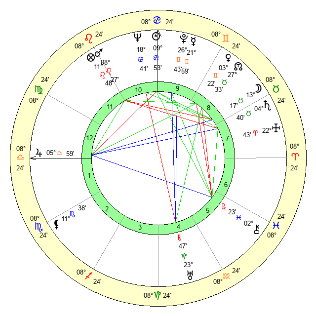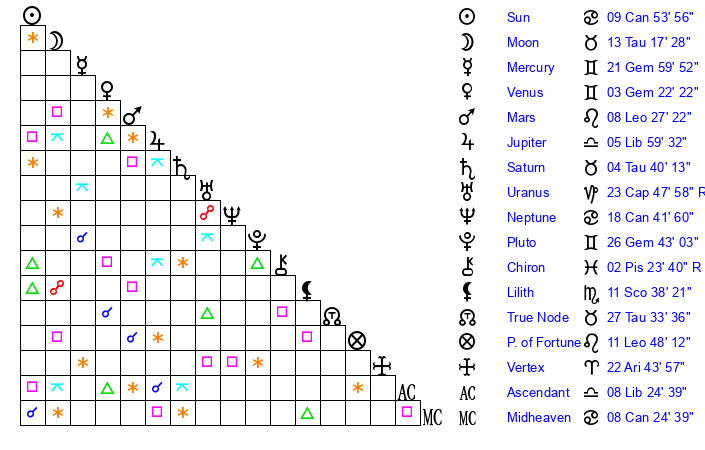 | Sun | 9 Cancer 54 | 11 Cancer 4 | 1 Scorpio 24 |