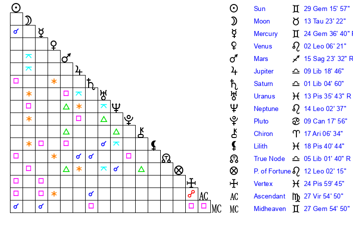 | Sun | 29 Gemini 16 | 0 Cancer 20 | 8 Libra 28 |
