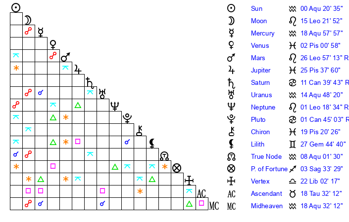 | Neptune | 1 Leo 18 | 27 Pisces 41 | 0 Leo 6 |