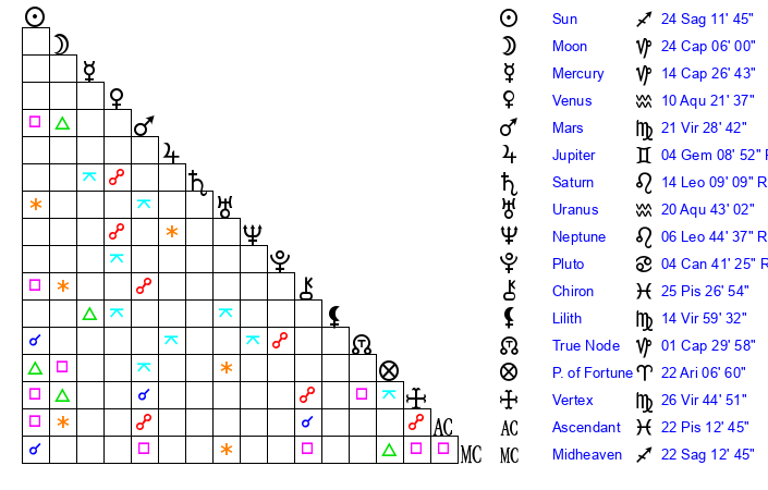 | Moon | 24 Capricorn 0 | 18 Scorpio 16 | 2 Capricorn 38 |