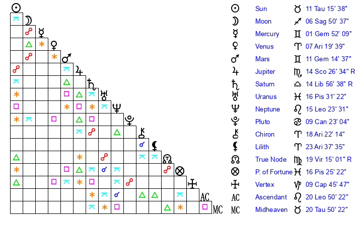 | Jupiter | 14 Scorpio 7 | 21 Gemini 43 | 10 Scorpio 43 |