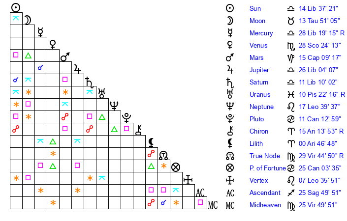 | Sun | 14 Libra 37 | 15 Libra 40 | 28 Capricorn 37 |
