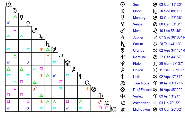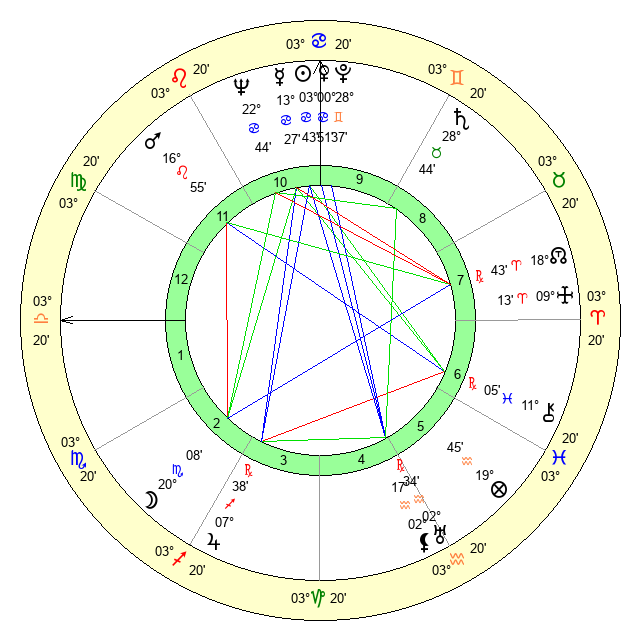| Moon | 20 Scorpio 5 | 8 Cancer 1 | 7 Capricorn 53 |