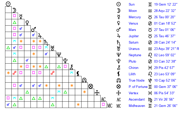 | Venus | 1 Cancer 19 | 4 Taurus 32 | 12 Scorpio 4 |