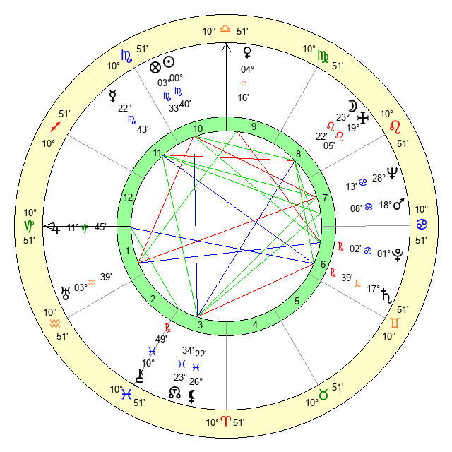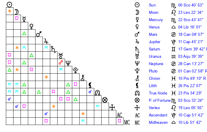 | Moon | 23 Leo 23 | 6 Sagittarius 19 | 4 Libra 58 |