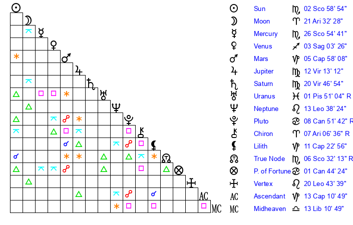 | Sun | 2 Scorpio 59 | 3 Scorpio 32 | 19 Aquarius 25 |