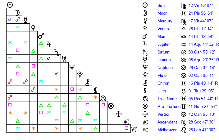 | Mercury | 17 Virgo 44 | 6 Virgo 5 | 26 Sagittarius 49 |
