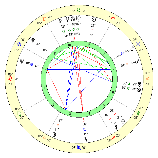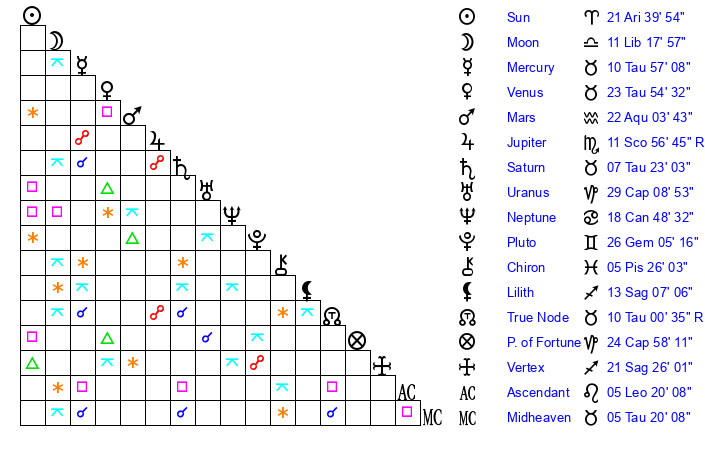 | Sun | 21 Aries 40 | 23 Aries 2 | 11 Leo 10 |
