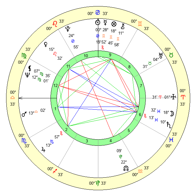 | Pluto | 24 Cancer 55 | 3 Aquarius 18 | 27 Cancer 5 |