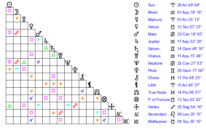 | Sun | 26 Aries 50 | 27 Aries 56 | 13 Leo 21 |