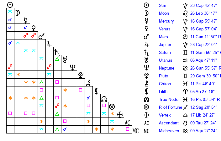 | Moon | 26 Leo 26 | 8 Sagittarius 32 | 0 Libra 38 |