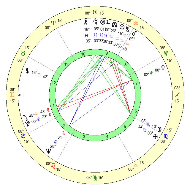 | Jupiter | 0 Pisces 24 | 11 Gemini 17 | 24 Pisces 5 |