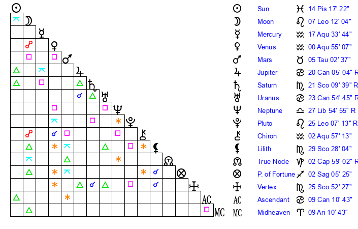 Moon | 7 Leo 15 | 1 Gemini 46 | 17 Aquarius 50 |