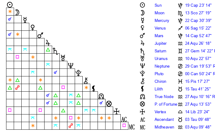 | Uranus | 10 Aquarius 20 | 27 Taurus 43 | 15 Aquarius 28 |