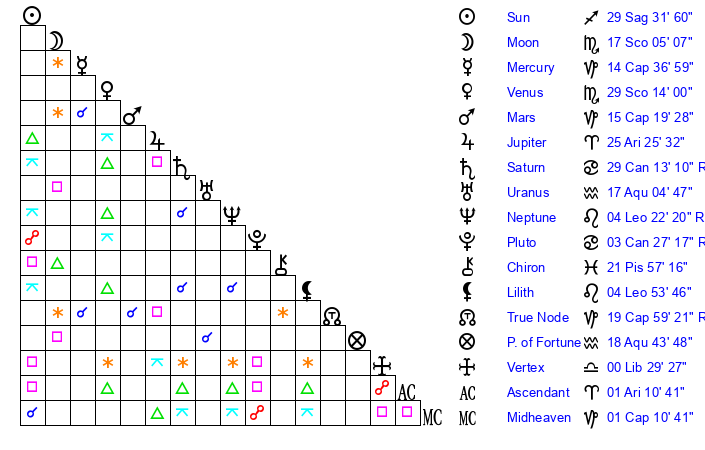 | Moon | 17 Scorpio 3 | 18 Capricorn 21 | 14 Scorpio 44 |
