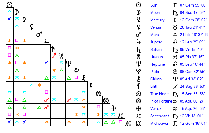 | Mercury | 12 Gemini 28 | 8 Gemini 0 | 20 Virgo 59 |