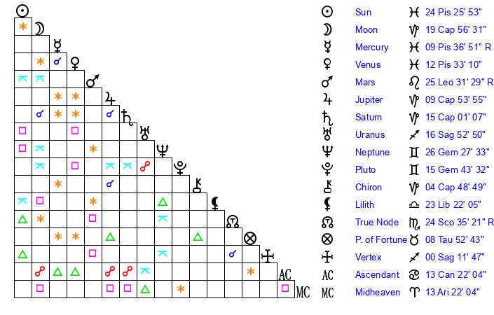 | Saturn | 15 Capricorn 30 | 22 Pisces 25 | 12 Capricorn 47 |