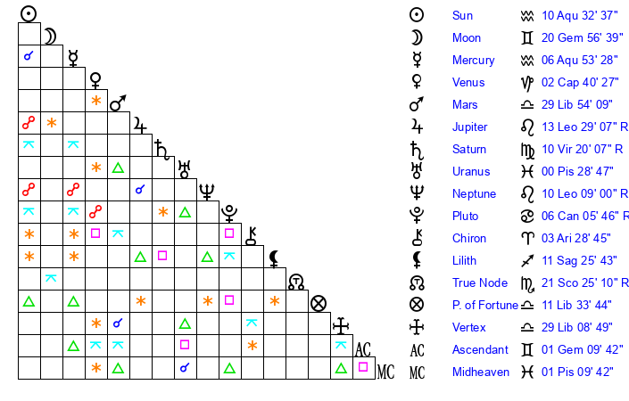 | Sun | 10 Aquarius 32 | 12 Aquarius 4 | 24 Taurus 32 |
