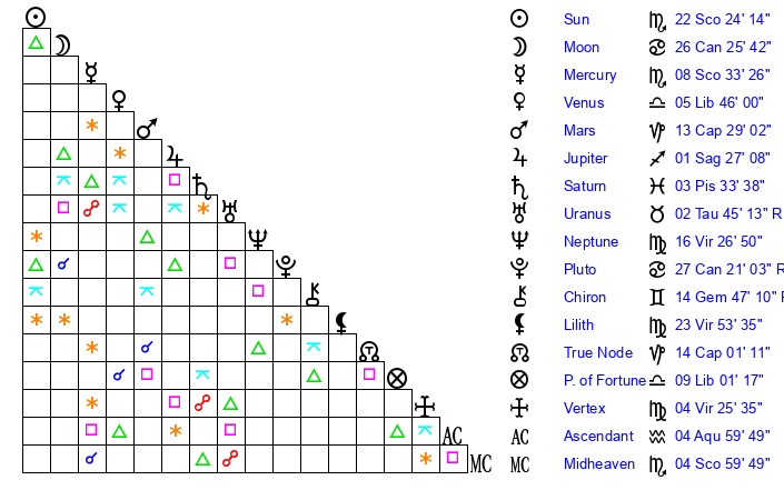 | Moon | 26 Cancer 27 | 3 Libra 37 | 2 Scorpio 11 |