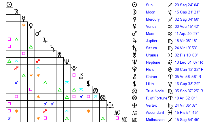 | Saturn | 25 Virgo 0 | 25 Pisces 15 | 21 Virgo 0 |