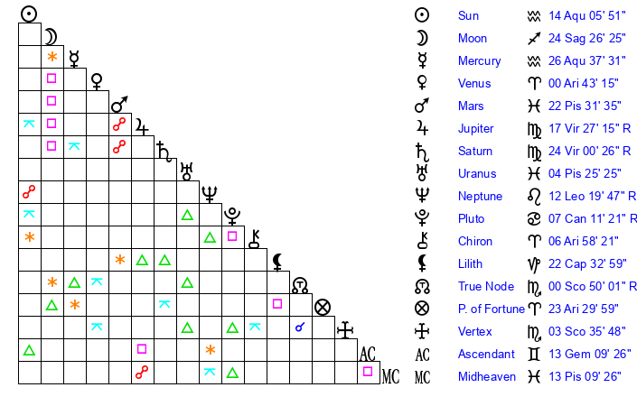 | Venus | 0 Aries 43 | 29 Pisces 21 | 24 Aries 14 |