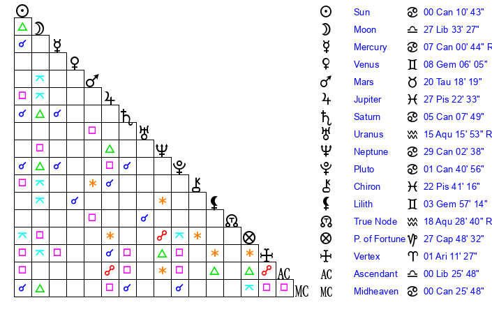 | Mercury | 6 Cancer 59 | 24 Cancer 17 | 6 Scorpio 58 |