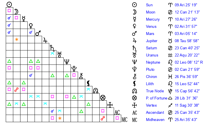| Moon | 12 Cancer 22 | 27 Aries 55 | 26 Gemini 14 |