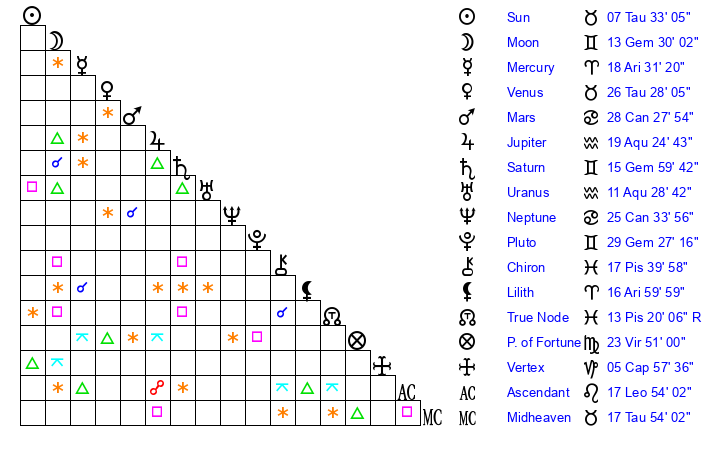 | Moon | 13 Gemini 34 | 21 Taurus 28 | 5 Cancer 42 |