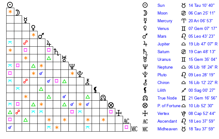 | Sun | 14 Taurus 11 | 15 Taurus 3 | 29 Cancer 49 |
