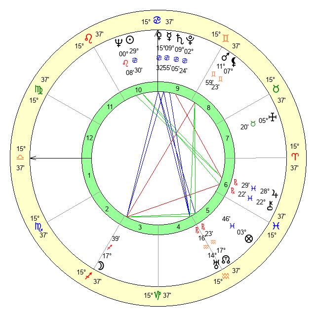 | Sun | 29 Cancer 30 | 0 Leo 51 | 16 Scorpio 58 |