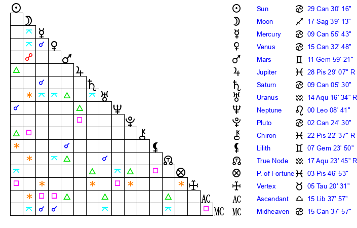| Saturn | 9 Cancer 45 | 1 Aries 43 | 17 Cancer 8 |